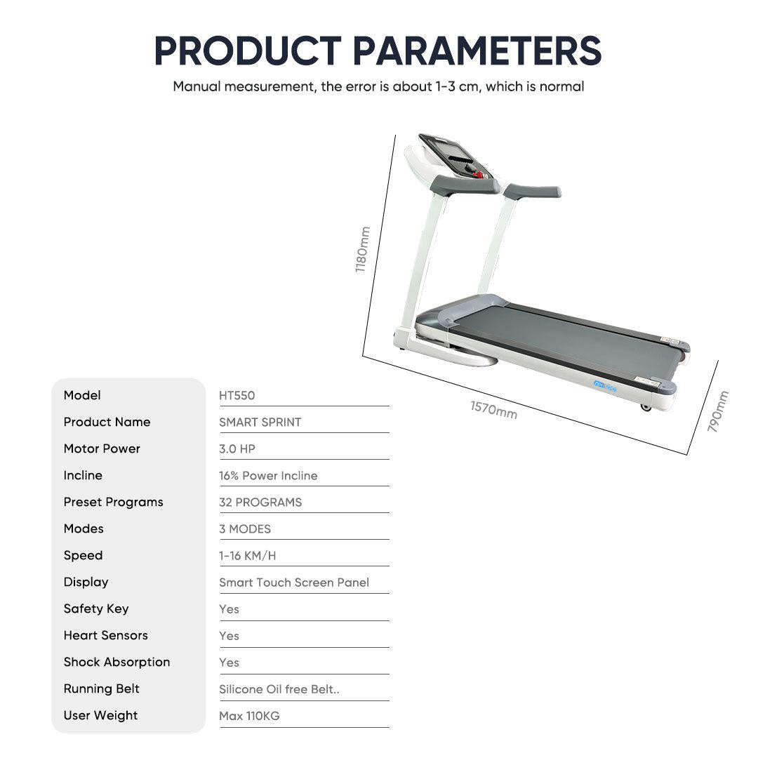- Quiet & Powerful 3.0 HP Motor: With a speed of 0- 16 km/ hr Smart Sprint packs a punch big enough for all your daily cardio workouts