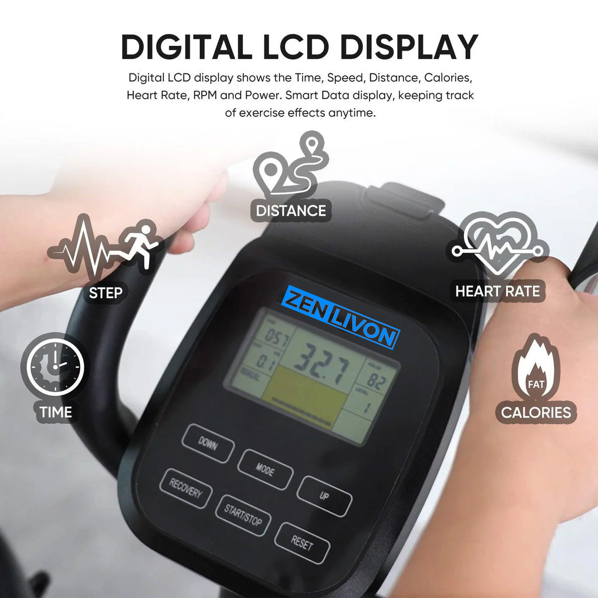 - Digital LCD Display: Digital LCD display shows the Time, Speed, Distance, Calories, Heart Rate, RPM and Power. Smart Data display, keeping track of exercise effects anytime.